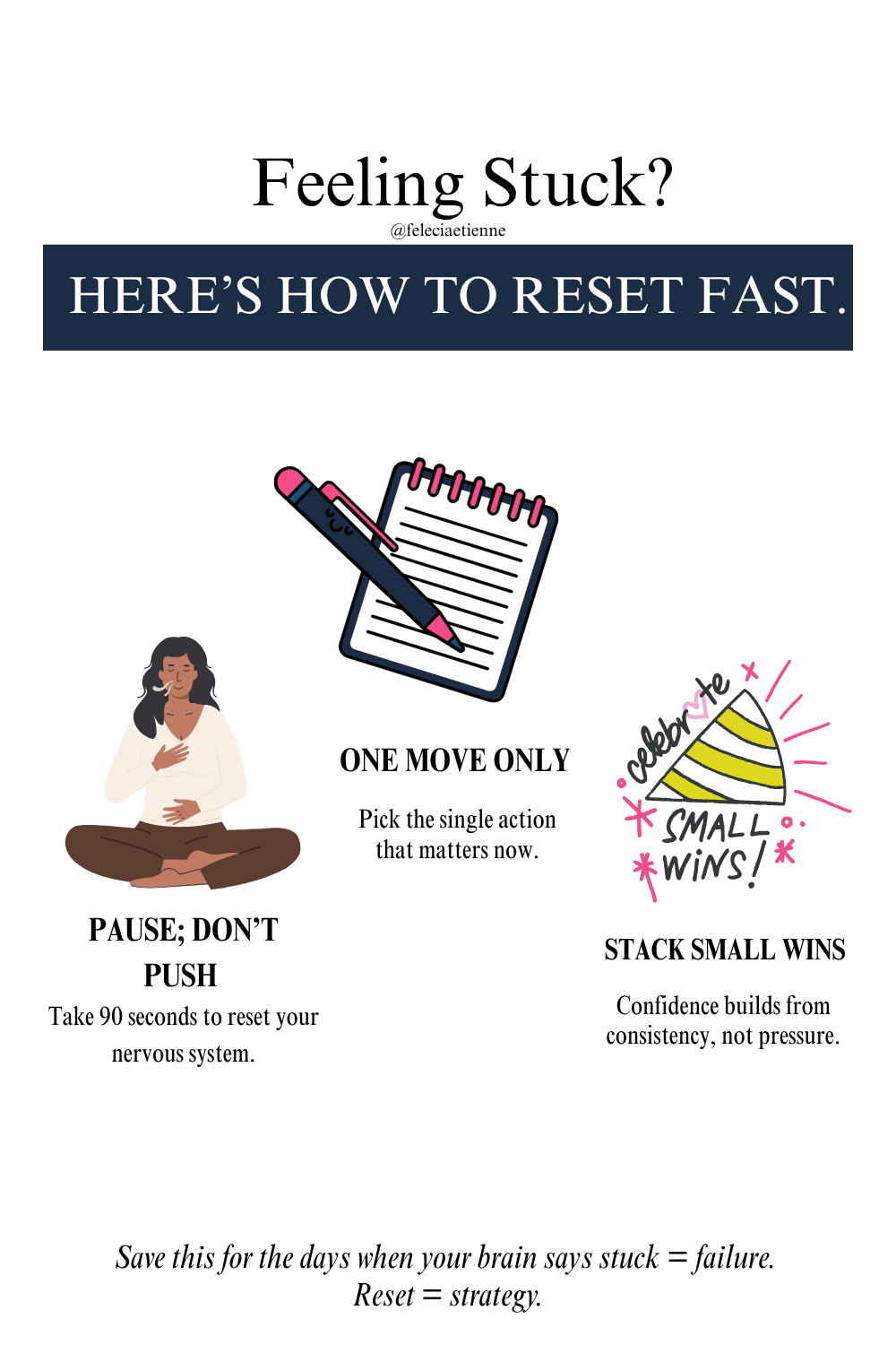 When you feel stuck, it’s not laziness; it’s your nervous system in freeze. Reset with three steps: pause for 90 seconds to calm stress, choose one clear next step, and rebuild momentum with micro-wins. Resetting isn’t weakness. It’s how you unlock your brain and move forward again.