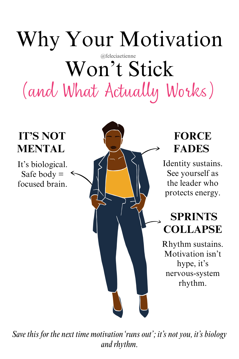 Motivation doesn’t come from hype; it comes from rhythm. Long-term motivation is fueled by dopamine (reward from progress), identity (who you believe you are), and nervous-system-safe rhythms (work/rest cycles).
